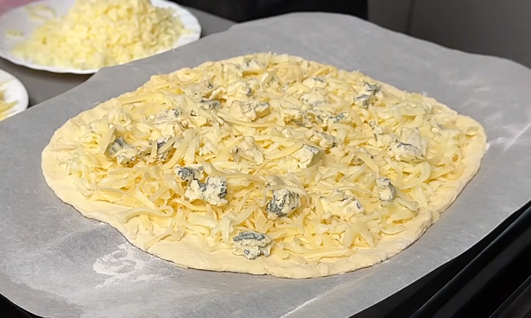6. Переложите раскатанное тесто на лист пергамента. Если пергамент слегка смять руками, он будет лучше лежать и не будет «подпрыгивать» в духовке. Равномерно распределите сыры: сначала более мягкие и сладкие — гауду и моцареллу, затем добавьте тертый пармезан, а сверху разложите кусочки сыра с плесенью. Такой порядок обеспечит правильное плавление и насыщенный вкус.