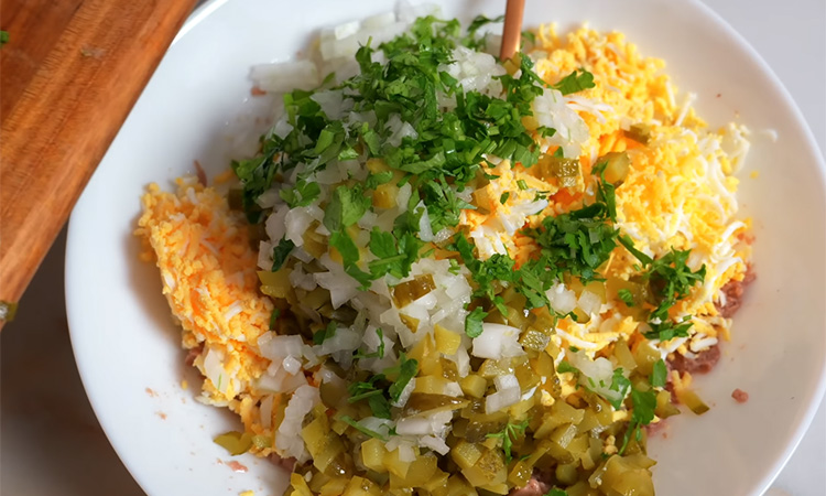 Пока основа выпекается, приготовьте начинку: мелко нарежьте 60 граммов маринованного огурца и четверть луковицы. Смешайте эти компоненты с 100 граммами печени трески и тремя отварными яйцами.