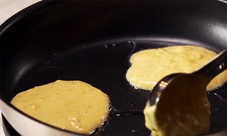 Переверните и продолжайте жарить, при желании добавив кусочек сливочного масла для более мягкого вкуса. Снимите оладьи, когда они станут полностью упругими и сохранят нежность внутри.