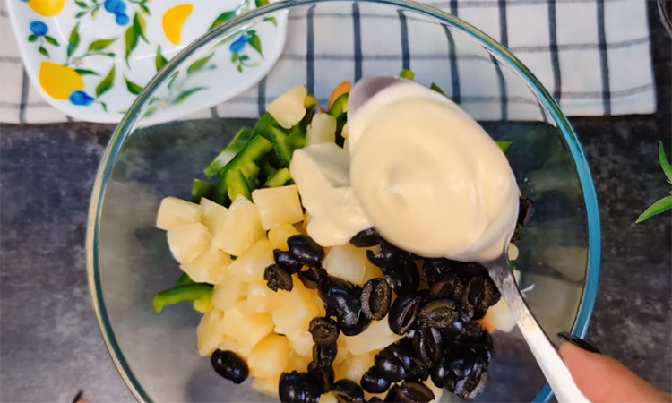 Разрежьте маслины пополам и перенесите их к остальным ингредиентам. Заправьте салат майонезом, подсолите и поперчите по вкусу, затем медленно перемешайте, чтобы ананасы сохранили форму и не потеряли свой сок.
