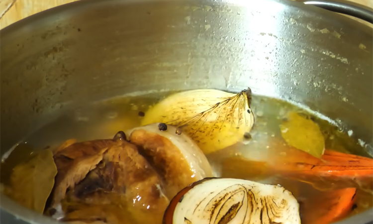 Снова доведите бульон до кипения, после чего снизьте огонь до самого слабого, чтобы кипение было еле заметным, и варите шесть-восемь часов. Если заметите, что выкипание идет слишком быстро, просто снизьте жар, но ни в коем случае не доливаите воду в процессе варки. По мере необходимости снимайте пенку. Прикроите кастрюлю крышкой таким образом, чтобы пар стекал не обратно в бульон, а в отдельную емкость. Когда холодец варится уже около шести часов, добавьте оставшиеся ингредиенты: пять-семь листиков лаврового листа и перец горошком. Лук и морковь предварительно разрежьте и зажарьте на сухой сковороде или при помощи газовой горелки до подпалин, что придаст бульону золотистыи цвет.