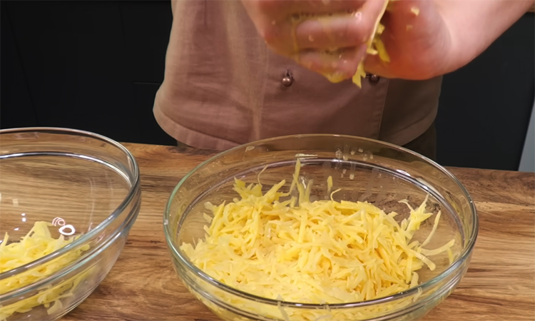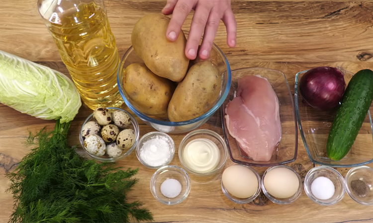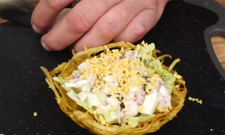 Держите до румяного цвета и устойчивой формы, затем аккуратно снимите гнездо с сита и выложите на бумажные полотенца, чтобы стек лишний жир. Повторите со всей картофельной массой. Для салата нарежьте остывшую куриную грудку небольшими кубиками. Куриные яйца очистите, нарежьте кубиком, один желток можно отложить и натереть отдельно для посыпки. Огурец вымойте и также нарежьте мелким кубиком. Лук нарежьте мелко, при желании можете быстро обдать его кипятком или слегка замариновать, чтобы смягчить вкус, затем обсушите.