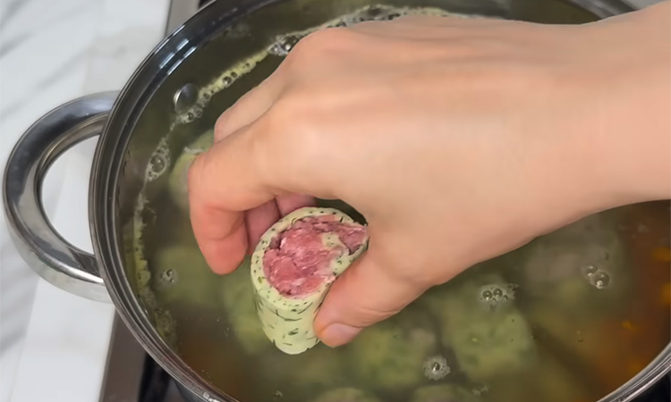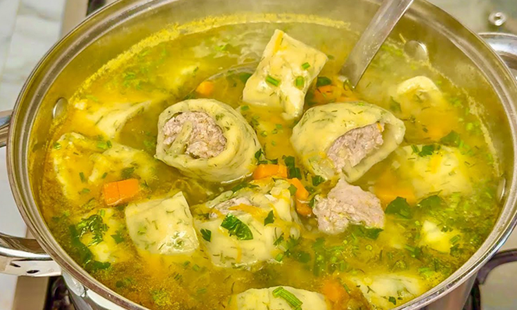 Посолите суп по вкусу. Теперь аккуратно опустите штрули в кипящий суп, стараясь не бросать их резко, чтобы они не развалились. После того как суп снова закипит, убавьте огонь до умеренного. Добавьте в кастрюлю овощную пассеровку из лука и тертой моркови, размешайте и варите еще 7 минут, пока тесто полностью не проварится, а фарш внутри штрули не дойдет до готовности.