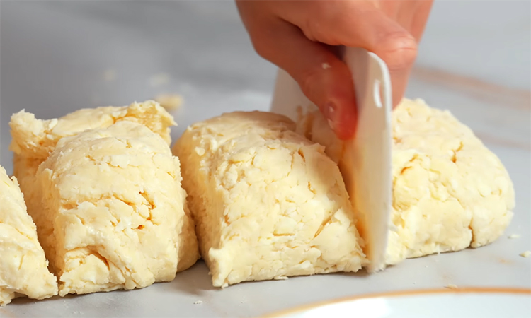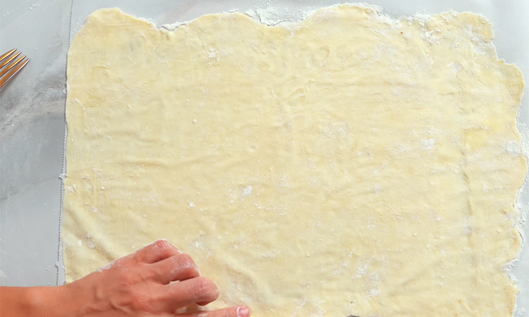 Сформируйте из теста прямоугольник, разделите его на четыре равные части, каждый кусок упакуйте в пленку, слегка выровняйте форму и уберите в холодильник минимум на один час. Охлажденное тесто раскатывайте сразу на пергаменте в прямоугольники размером около 40 на 25 см, подрезая излишки и заполняя пустоты обрезками.
