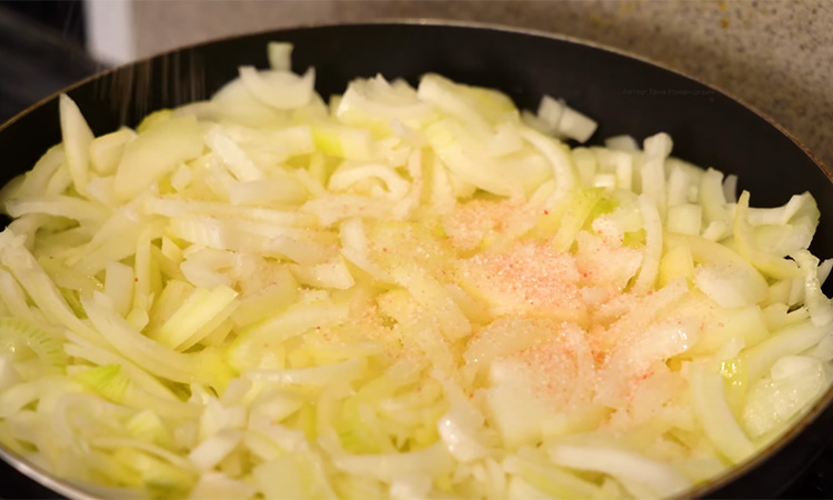 Разогрейте сковороду, влейте немного растительного масла, отправьте лук и обжаривайте до мягкости и золотистого оттенка. Посолите и поперчите в процессе, затем снимите с огня и остудите, лук должен остаться мягким, не нужно его зажаривать слишком сильно. Разбейте яйца в миску, посолите, поперчите и хорошо взболтайте венчиком до однородности. Влейте молоко и снова перемешайте, чтобы масса стала более мягкой по текстуре.
