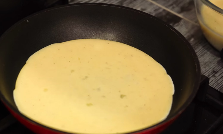Разогрейте сковороду, масло не добавляйте, влейте часть яичной смеси и накройте крышкой, дождитесь, когда верх станет матовым и схватится. Переверните блинчик, прогрейте несколько секунд и переложите остывать, затем приготовьте остальные, ориентируйтесь по диаметру сковороды и толщине. Остывшие блинчики нарежьте полосками, затем нарежьте соломкой.