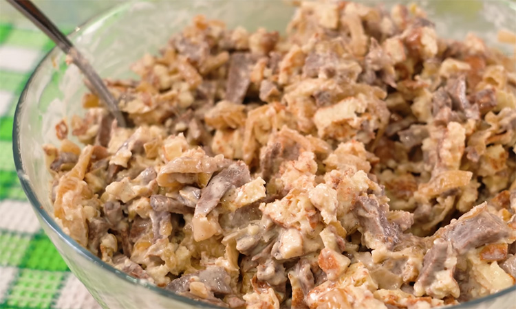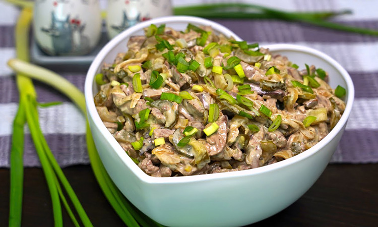 Сердечный салат заметен даже на самом обильном на столе за счет мясной основы, мягкого лука и нежной яичной соломки.