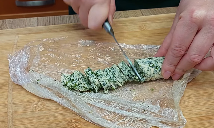 Разогрейте сковороду с небольшим количеством растительного масла. Половину луковицы нарежьте крупно и выложите на сковороду, добавьте щепотку сахара и соль, обжаривайте до мягкости и легкой золотистости, затем снимите с огня и остудите. Хлеб переложите в миску, залейте молоком и оставьте набухать. Зелень мелко нарежьте. Сливочное масло переложите в миску, добавьте соль и перец, вмешайте зелень, хорошо разомните и сформируйте колбаску, заверните в пленку и уберите в морозильник до застывания.