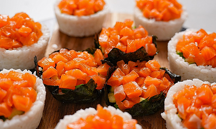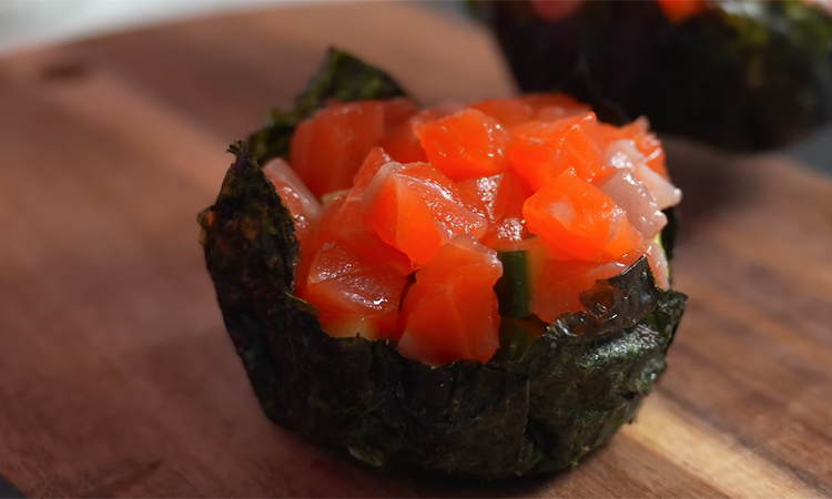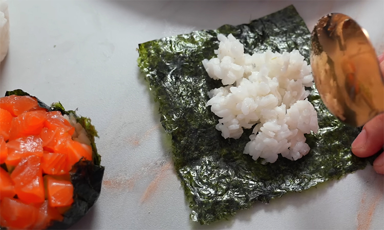Лосось нарежьте аккуратным кубиком. Лист нори при желании разрежьте на четыре части. Формочки для маффинов слегка смочите водой. Выложите в каждую формочку по столовой ложке риса и аккуратно утрамбуйте, формируя дно и стенки корзинки. При необходимости смачивайте руки водой, чтобы рис не прилипал.