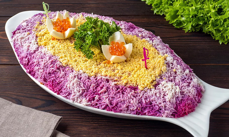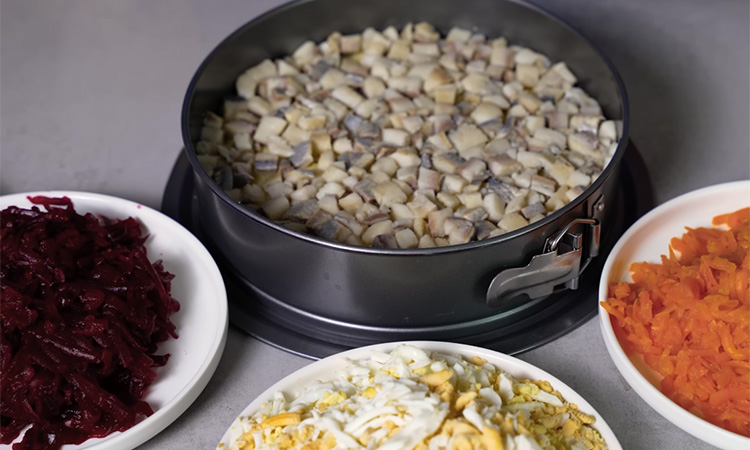 Селедка под шубой часто выходит водянистой: где-то течет свекла, где-то лук дает чрезмерную резкость, а сам вкус соленой рыбы теряется. В грузинском варианте классический салат звучит иначе: здесь маринованный лук только усиливает вкус рыбы и овощей, а не перетягивает все внимание на себя. Рыба режется чуть крупнее обычного, картофельный слой делается аккуратнее, в итоге же у вас получится аппетитная, сочная селедка под шубой.