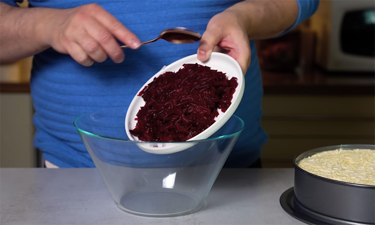 Свеклу смешайте с майонезом, приправьте солью и перцем по вкусу, закройте верхним слоем и разровняйте поверхность. Поставьте салат в холодильник хотя бы на 1–2 часа, а если есть время, выдержите ночь, затем снимите кольцо и нарежьте порционно.