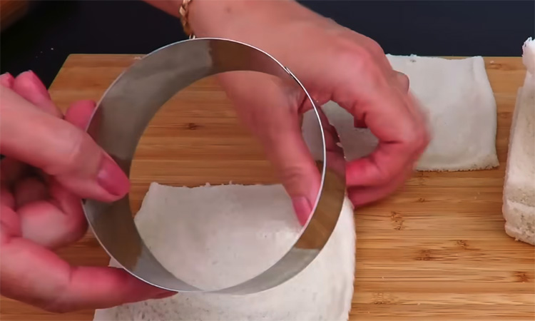 Подготовьте основу для кармашков: возьмите тостовый хлеб без корочек, раскатайте каждый ломтик скалкой до более тонкого и пластичного состояния. Вырежьте кружочки выемкой или стаканом диаметром около 10 см, затем смочите край одного кружочка водой, накройте вторым и хорошо защипните по периметру, чтобы шов был плотным и не расходился при жарке. Сделайте нужное количество заготовок, ориентируясь на то, сколько порций хотите подать.