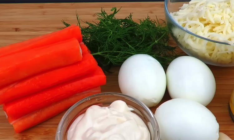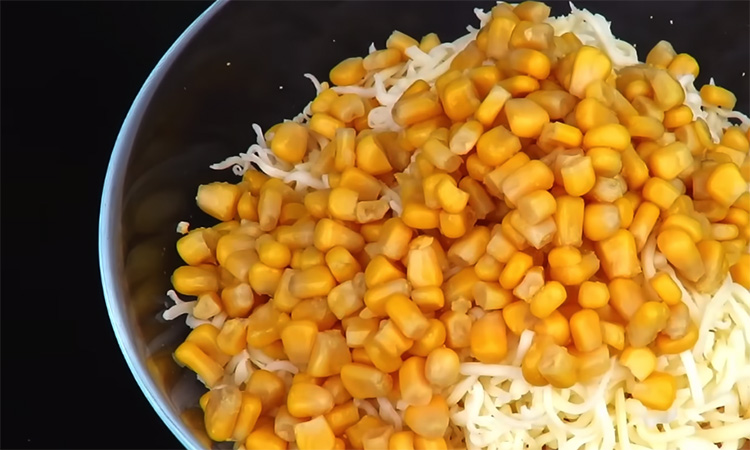 Нарежьте крабовые палочки мелкими кусочками и отправьте в миску. Натрите вареные яйца на крупной терке и добавьте к крабовым палочкам, затем всыпьте тертый сыр. Слейте жидкость с кукурузы, переложите зерна в миску и перемешайте. Натрите чеснок на мелкой терке или пропустите через пресс, мелко нарежьте укроп и добавьте к начинке, после чего заправьте майонезом, посолите и поперчите, затем тщательно перемешайте и обязательно попробуйте, чтобы скорректировать соль и плотность.