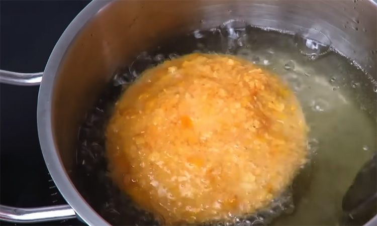 Приготовьте панировку: разбейте яйца в миску, посолите и разболтайте вилкой до однородности. Измельчите кукурузные хлопья в крошку, чтобы ими было удобно обсыпать заготовки, либо подготовьте панировочные сухари. Налейте растительное масло в небольшой сотейник и хорошо разогрейте, затем проверьте готовность, опустив деревянную палочку: если вокруг идут пузырьки, масло готово к жарке.