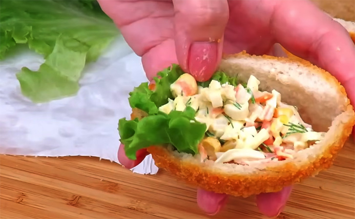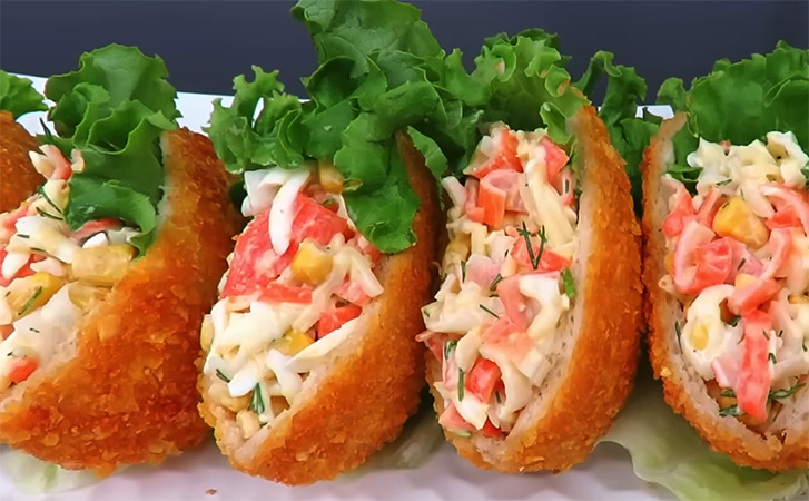Согласитесь, на праздники всегда хочется иметь под рукой закуску, которая выглядит нарядно и при этом не требует сложной сервировки. Такой вариант крабового салата в хрустящих хлебных кармашках хорош тем, что порция уже собрана и ее удобно подать гостям без дополнительных тарелок и приборов. Начинка получается нежной и сытной, а снаружи остается хрустящая основа, которой крабовому салату обычно не хватает.