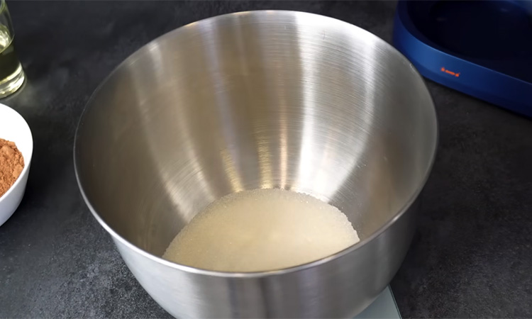 Отправьте сахар и какао в чашу миксера или в глубокую миску, залейте молоком и растительным маслом, затем перемешайте до полной однородности, чтобы смесь стала гладкой и без комочков. Отлейте треть этой шоколадной жидкости по весу, ориентируйтесь на 200 г, и оставьте ее рядом, она понадобится сразу после выпечки. В оставшуюся часть разбейте два яйца, добавьте щепотку соли и ванильный сахар или ванилин, после чего перемешайте до ровной консистенции.