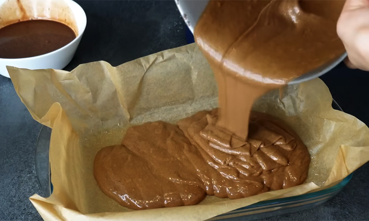 Всыпьте муку и разрыхлитель, затем перемешайте миксером или венчиком так, чтобы тесто стало однородным и без сухих включений. Застелите форму бумагой для выпечки, перелейте тесто, разровняйте поверхность и отправьте в заранее разогретую духовку.
