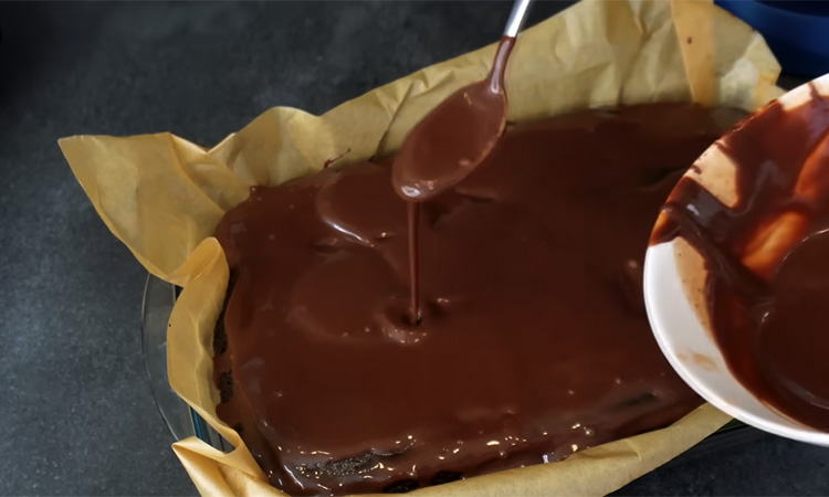 Достаньте пирог и сразу, пока он горячий, залейте сверху отложенной шоколадной жидкостью, распределяя ее по поверхности равномерно. Оставьте пирог полностью остыть прямо в форме, за это время лишняя влага впитается, а верхняя часть станет нежной шоколадной глазурью.