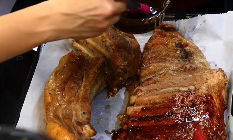 Смажьте ребрышки глазурью со всех сторон. Отправьте противень в духовку, разогретую до 180 градусов. Запекайте 10–15 минут до румяной карамельной корочки.