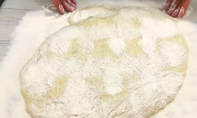 После финального складывания смажьте поверхность растительным маслом или водой, накройте и поместите в теплое место для брожения на один час. Обильно присыпьте рабочую поверхность мукой, осторожно переложите подошедшее тесто и сформируйте из него прямоугольный пласт. Разделите массу на несколько равных частей, аккуратно сложите каждую заготовку и выложите их на противень для окончательной расстойки на двадцать минут.