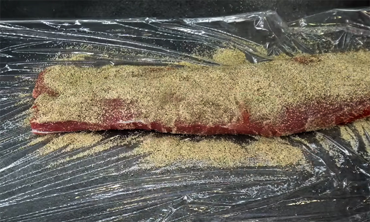 Рассчитайте количество нитритной соли исходя из пропорции семнадцать граммов на один килограмм продукта; например, для куска весом пятьсот граммов потребуется восемь с половиной граммов соли. Смешайте соль с черным молотым перцем и сушеным чесноком, после чего тщательно натрите этой смесью кусок мяса со всех сторон. Оберните мясо в пищевую пленку и уберите в холодильник на двое суток для маринования и созревания, что обеспечит безопасность, характерный розовый цвет и деликатесный вкус.