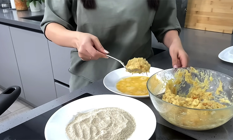 Сформируйте небольшие котлеты влажными руками, обмакните каждую сначала во взбитое яйцо, а затем обильно обваляйте в панировочных сухарях со всех сторон. Обжаривайте заготовки на разогретой сковороде с растительным маслом на умеренном огне до появления выраженной румяной корочки с обеих сторон.