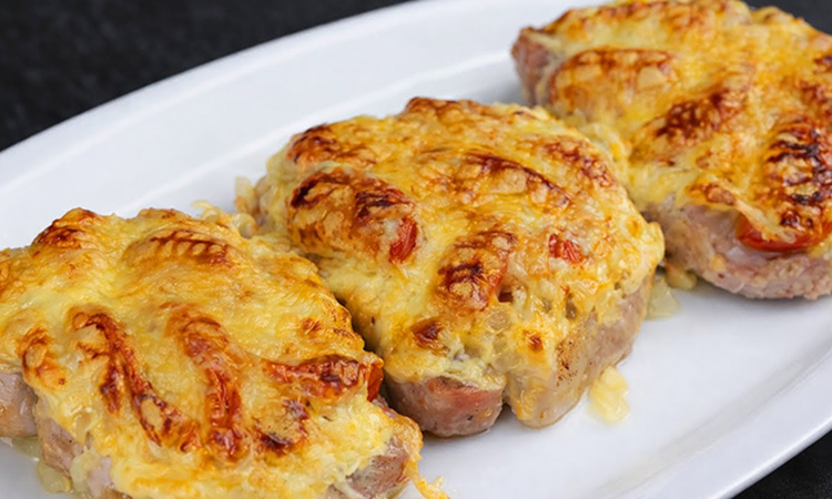 Готовое мясо достаньте из духовки и подавайте горячим вместе с порцией картофельной лепешки. Правильное сочетание маринованных огурцов и сыра в топпинге делает это мясо по-настоящему сочным и ароматным.