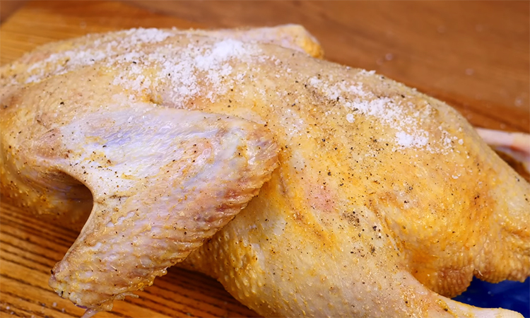 Тушку нужно тщательно обсушить бумажными полотенцами. Удалите крайние фаланги крыльев и лишнюю кожу в районе шеи, чтобы избежать подгорания в процессе запекания. Острым кончиком ножа или термометром сделайте частые проколы по всей поверхности кожи, стараясь не задевать само мясо, что поможет лишнему жиру равномерно вытапливаться. Натрите внутреннюю часть птицы солью и черным перцем, затем поместите внутрь дольки половины апельсина, раздавленный чеснок, лавровый лист и свежие травы.