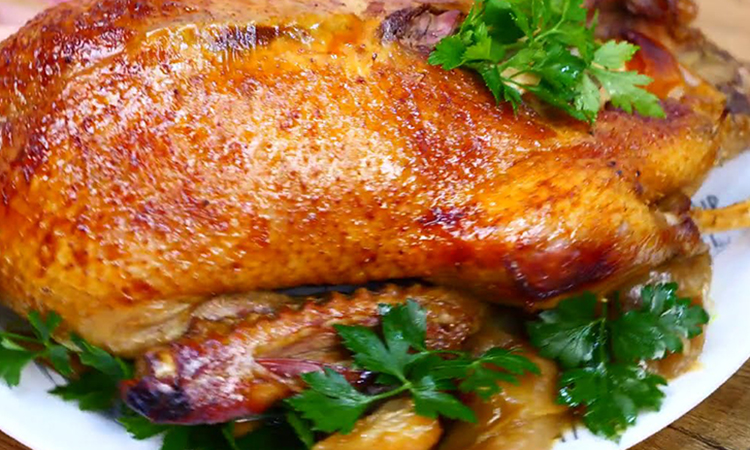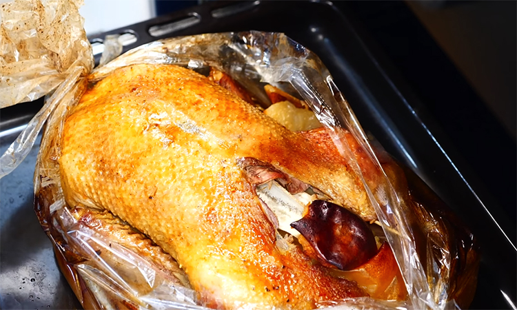 Свяжите ножки кухонной нитью, чтобы сохранить форму и ароматы внутри, прикройте тонкие части ножек остатками кожи или фольгой и оставьте мясо прогреться при комнатной температуре на полчаса. Отправьте утку на противне с высокими бортиками в разогретую до двухсот градусов духовку на тридцать пять минут, не накрывая ее ничем. Спустя это время осторожно достаньте птицу, полностью слейте вытопившийся жир и розовый сок в отдельную емкость, а температуру в духовке снизьте до ста восьмидесяти градусов.