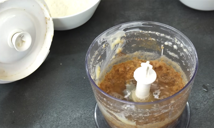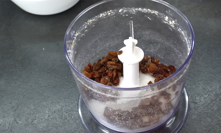 Для начала необходимо подготовить овсяную основу, измельчив сто граммов овсяных хлопьев в блендере до состояния муки. В чашу блендера поместите сахар, заранее запаренный кипятком и обсушенный изюм, молотую корицу и соль, после чего добавьте мягкое сливочное масло и пробейте массу до однородности. В полученную смесь влейте семьдесят миллилитров горячей воды и еще раз перемешайте, затем добавьте измельченную овсяную муку.