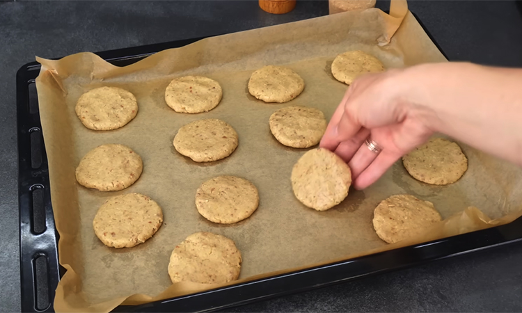 Переложите массу в миску, всыпьте пшеничную муку, предварительно смешанную с разрыхлителем, и замесите плотное тесто без добавления яиц. Готовое тесто уберите в холодильник на двадцать минут, чтобы овсяная мука набухла, а само тесто стало удобным для формовки. Сформируйте из охлажденной массы небольшие шарики весом примерно по двадцать пять граммов, слегка придавите их рукой, придавая форму дисков, и выложите на противень.