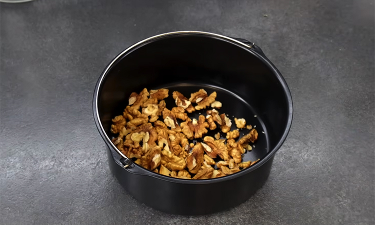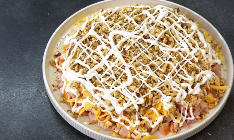 Подготовьте грецкие орехи, подсушив их в духовке в течение десяти минут или в аэрогриле около четырех минут, а затем измельчите остывшие ядра ножом. Копченое куриное филе отделите от костей и нарежьте аккуратными кубиками, выложив их первым слоем на плоское блюдо и смазав майонезом. Поверх мяса распределите натертый на крупной терке твердый сыр и нанесите щедрый слой майонеза для сочности будущего салата.