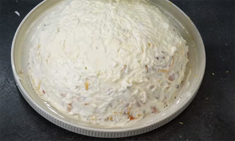 Третьим слоем выложите подготовленные орехи, снова смажьте майонезом и на этом этапе начните аккуратно формировать руками подобие горки. Отваренные вкрутую яйца натрите на мелкой терке и покройте ими всю поверхность салата, окончательно выравнивая форму, после чего еще раз обильно смажьте верхушку и бока майонезом.