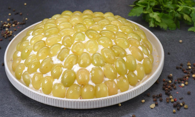 Зеленый виноград разрежьте на половинки, удалите косточки при необходимости и плотно обложите ими всю площадь салата, стараясь не оставлять промежутков. Готовое блюдо необходимо убрать в холодильник минимум на четыре часа, чтобы все слои пропитались соусом и ароматами друг друга.
