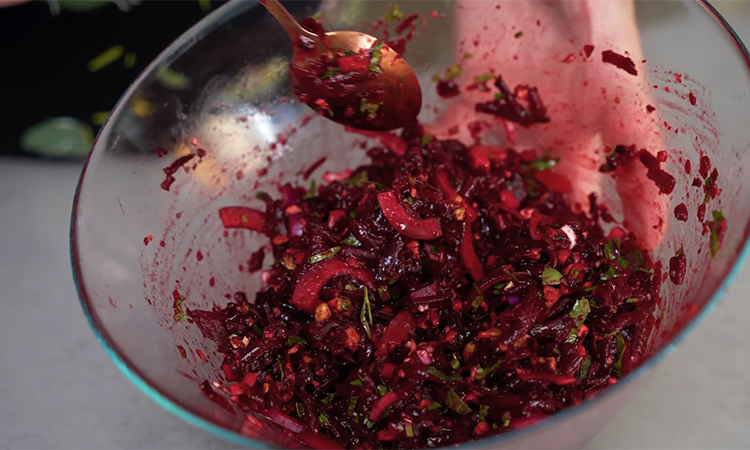 В емкость к свекле добавьте нарезанный лук, зелень, орехи и пропущенный через пресс или мелко порубленный чеснок. Приправьте салат сладкой паприкой, хмели-сунели, черным и острым перцем, создавая основу пряного аромата. Влейте соус ткемали, который обеспечит правильный баланс кислоты и сладости, либо замените его винным уксусом или лимонным соком при отсутствии традиционного соуса. Заправьте салат нерафинированным подсолнечным маслом и тщательно перемешайте, чтобы специи и соус равномерно распределились по всем ингредиентам.