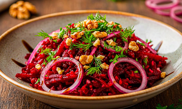 Традиционные грузинские закуски славятся своим умением балансировать между сладостью, кислотой и остротой, создавая неповторимый гастрономический профиль. Этот салат из обычной свеклы — как раз из таких рецептов. Использование соуса ткемали или винного уксуса придает основе необходимую пикантность и легкий маринованный оттенок, грецкие орехи в данном сочетании отвечают за плотную структуру и сытность, делая салат полноценным элементом даже праздничного. Пряные травы и ароматное масло завершают композицию, превращая привычный овощ в изысканное угощение с южным характером.