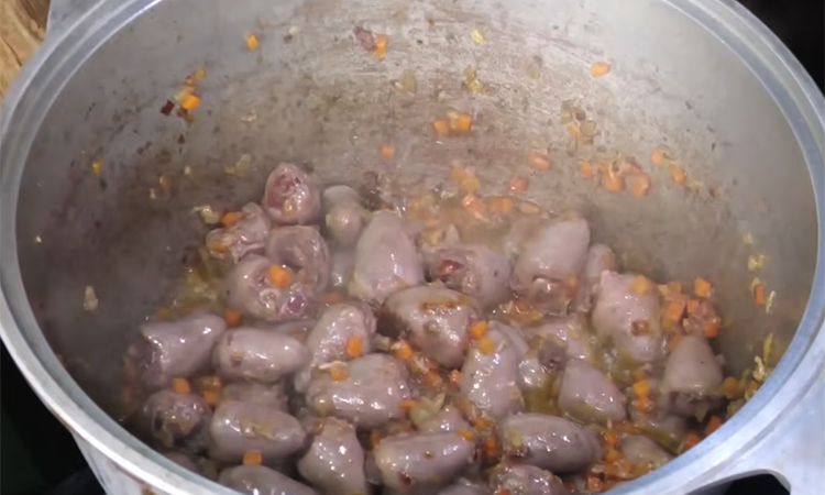 В глубоком казанке или кастрюле с толстым дном раскалите растительное масло, обжарьте сначала лук до золотистого цвета, затем добавьте морковь и подготовленные куриные сердечки. Тщательно обжарьте все ингредиенты вместе, введите мелко натертый чеснок и готовьте еще пару минут при постоянном помешивании для раскрытия аромата.