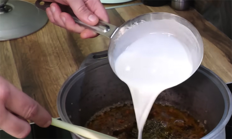 Отдельно разведите обжаренную муку в сливках так, чтобы не осталось комочков, и аккуратно влейте эту смесь в казанок, интенсивно помешивая соус. Доведите гуляш до кипения и проварите на слабом огне еще пять минут, пока соус заметно не загустеет и не станет глянцевым.