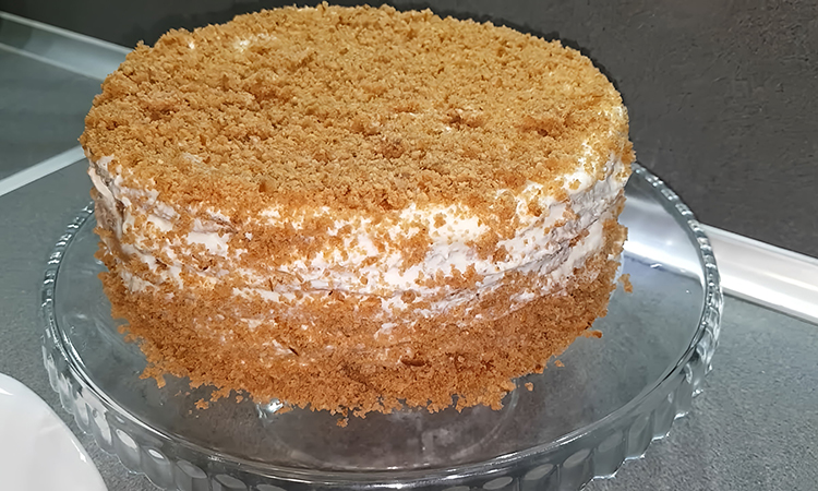 Торт прямо со сковороды, с золотистой крошкой, пропитанной нежнейшим кремом с легкой кислинкой сметаны и сладостью вареной сгущенки. Отрежьте кусочек, почувствуйте, как хрустящие слои тают во рту, оставляя приятное карамельное послевкусие, и попробуйте остановиться на одной порции — этот десерт без преувеличений готовится всего 15 минут, такой рецепт вас точно выручит на Новый год.