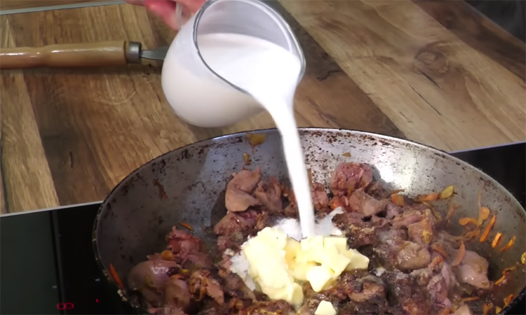 Выложите в сковороду печень и при постоянном помешивании тушите ее до тех пор, пока вся поверхность не побелеет. Засеките пять или семь минут для дальнейшего тушения, после чего введите соль, молотый черный перец, кориандр, мускатный орех и сухой чеснок. Влейте в общую массу сливки и добавьте сливочное масло, сразу снижая огонь до самого слабого уровня.