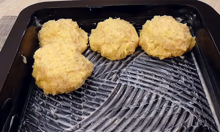 Тщательно перемешайте все компоненты и оставьте фарш на десять минут для набухания манки. Смажьте форму для запекания сливочным маслом, сформируйте небольшие котлетки и выложите их плотными рядами. Поставьте форму в разогретую до ста восьмидесяти градусов духовку на двадцать пять минут для предварительного запекания.