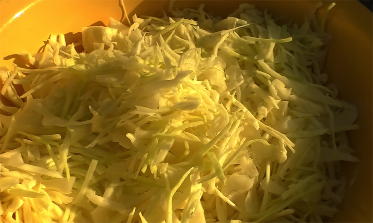 Нашинкуйте капусту тонкой соломкой ножом или шинковкой и переложите в большую миску. Натрите морковь на крупной терке и добавьте к капусте. Посолите овощи, аккуратно перемешайте руками и слегка сожмите, чтобы капуста начала выделять сок. Добавьте острый перец и еще раз перемешайте, равномерно распределяя остроту по массе.