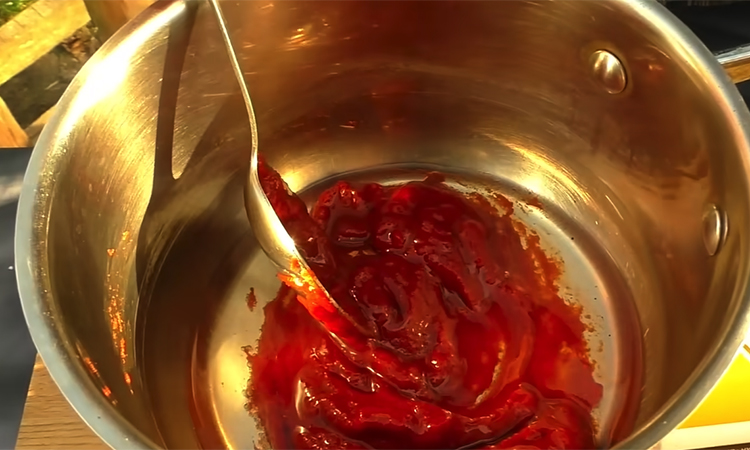 Влейте растительное масло в небольшую сковороду или сотейник, добавьте томатную пасту и поставьте на средний огонь. Прогрейте пасту, постоянно помешивая, дайте ей закипеть и слегка рассыпаться на комочки, не добиваясь полного растворения. Прожарьте томатную пасту около одной минуты, затем снимите с огня.