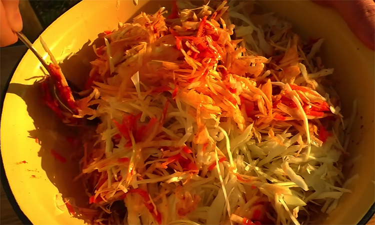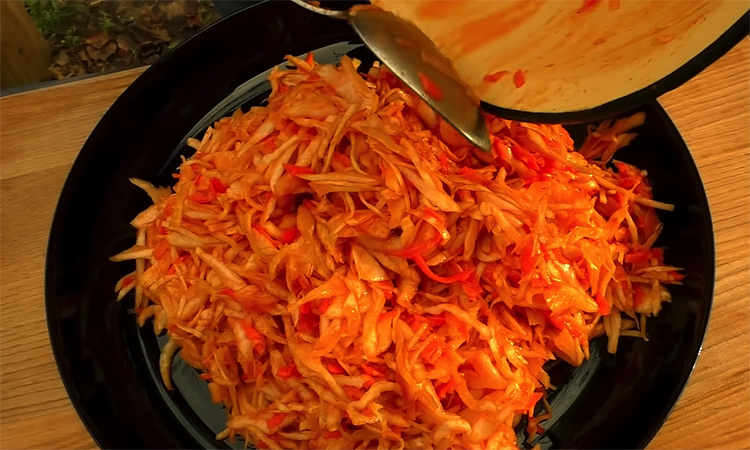 Вылейте горячую томатно-масляную смесь на капусту, стараясь распределить ее по всей поверхности. Быстро и тщательно перемешайте овощи, чтобы горячее масло равномерно обволокло капусту и морковь. Влейте уксус, снова перемешайте и накройте миску крышкой или пленкой.