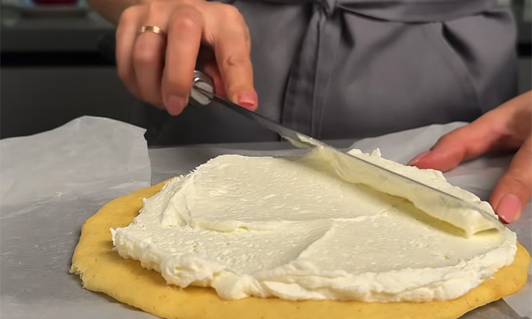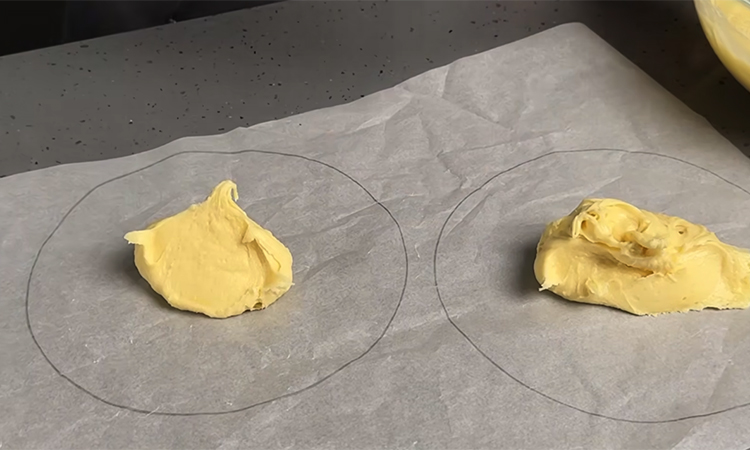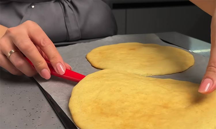 Добейтесь консистенции, при которой тесто легко распределяется ложкой тонким слоем. Разогрейте духовку до 180 градусов. Подготовьте пергамент, обведите форму диаметром 18–22 см и переверните лист на чистую сторону. Выложите тесто порциями и распределите его тонким слоем по контуру. Перенесите пергамент на противень и выпекайте коржи около 8 минут до светлого золотистого оттенка.