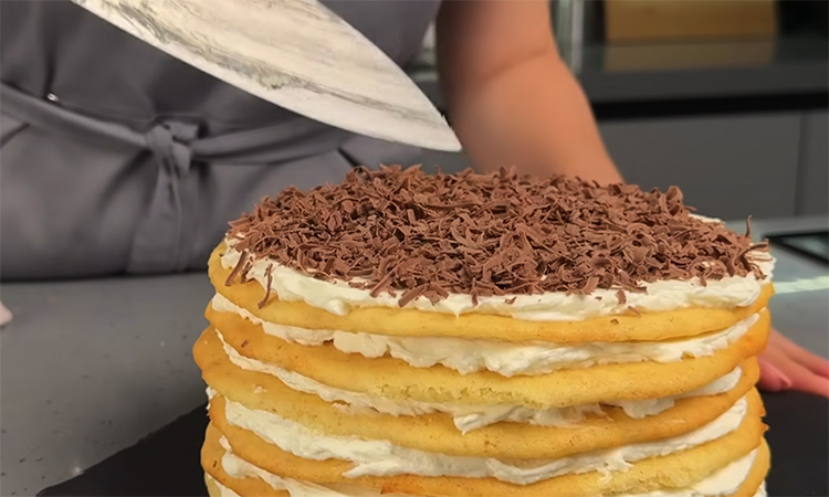 Выложите первый корж на основу, нанесите слой крема и равномерно распределите. Повторите сборку, чередуя коржи и крем, слегка прижимая каждый слой. Верх и бока торта покройте кремом.
