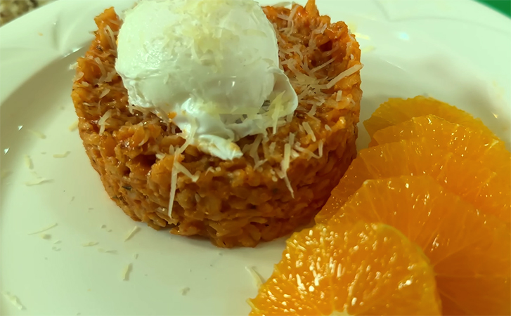В готовую кашу вмешайте кусочек сливочного масла и выложите ее в тарелку, используя кулинарное кольцо для красивой подачи. Сверху аккуратно поместите яйцо пашот, посыпьте блюдо тертым твердым сыром и украсьте дольками апельсина для свежего послевкусия.