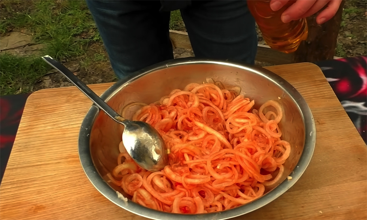 Добавьте к подготовленному луку несколько ложек томатного соуса или сацибели и влейте ароматное подсолнечное масло с запахом семечек. Хорошо перемешайте закуску, чтобы соус и масло равномерно распределились по каждому кусочку, создавая однородную глянцевую поверхность.