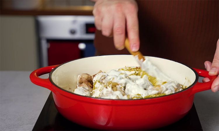 В ту же сковороду отправьте мелко нарезанный лук и жарьте его до состояния карамелизации, пока он не станет мягким и золотисто-коричневым. К обжаренному луку добавьте измельченный чеснок, прогрейте его в течение двух минут и верните в сковороду куриное мясо вместе с выделившимся соком. Влейте сметану, добавьте горчицу, соль, хмели-сунели, черный перец и хлопья острого перца по вашему вкусу.