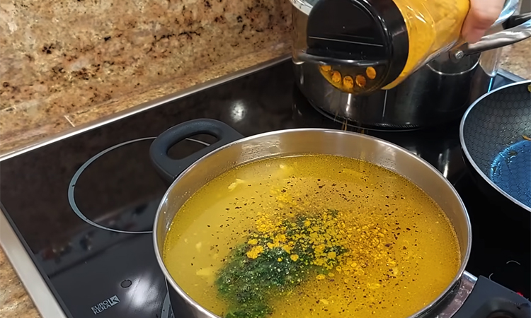 Тем временем отделите остывшую рыбную мякоть от костей и верните ее в суп вместе с подготовленной овощной зажаркой. Всыпьте куркуму для цвета, добавьте черный молотый перец, измельченную зелень петрушки и при необходимости подкорректируйте количество соли.